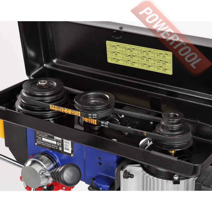 Имеется двенадцать ступеней скорости вращения шпинделя, что необходимо при выполнении различных операций и типах материала. Переключение производится за счет переброски ремней. Для этого необходимо открыть крышку ременного отсека, ослабить барашек крепления двигателя, тем самым получив возможность смещения шкива, перекинуть ремень и проделать операцию в обратной последовательности.