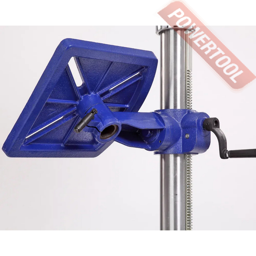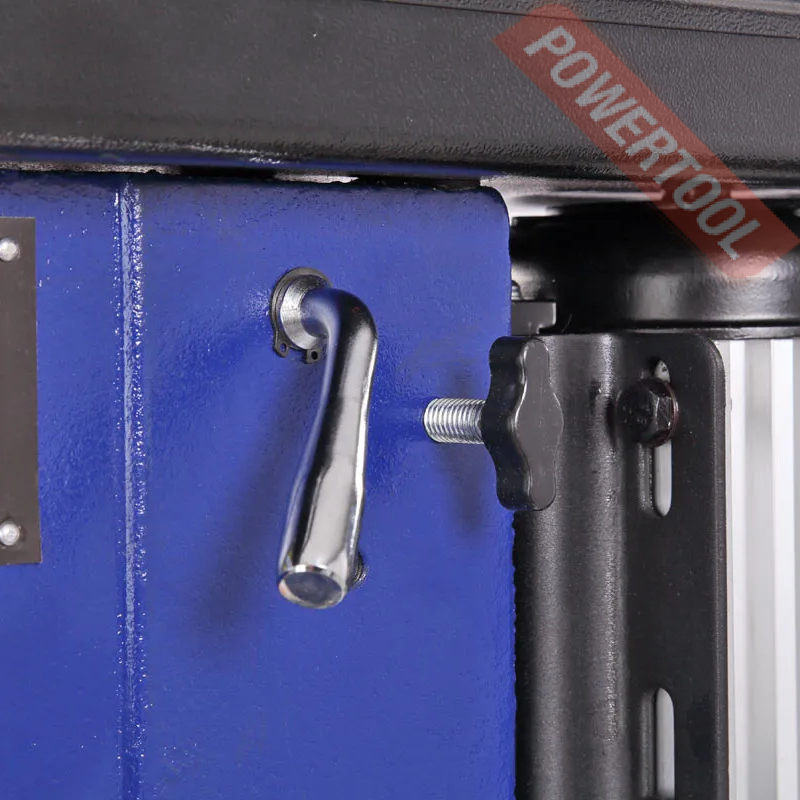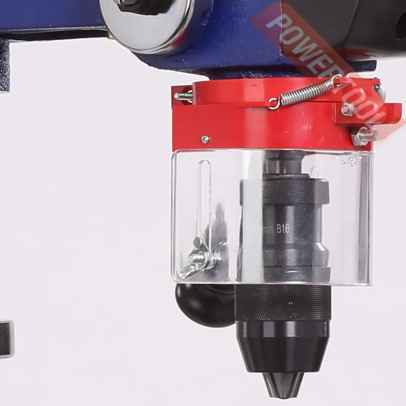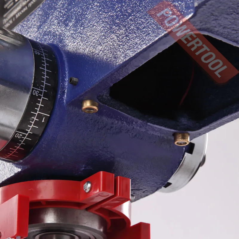 В комплекте предусмотрены тиски. Для их крепления есть четыре паза на рабочем столе и два на основании. Шкала, расположенная на рукоятке регулировки глубины сверления, показывает ход пиноли шпинделя, с ее помощью можно настраивать ход пиноли, для этого необходимо провернуть шкалу, стрелка на корпусе будет показывать значение, на которое будет возможно погружение сверла, затем затянуть барашек. Наконечники тройной рукояти удобной формы, что способствует плавной подаче сверла к заготовке. Для точного позиционирования станок оснащен лазером - указателем.