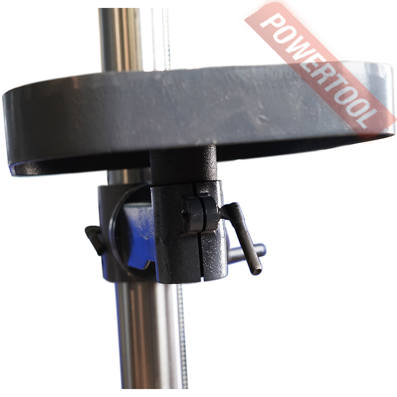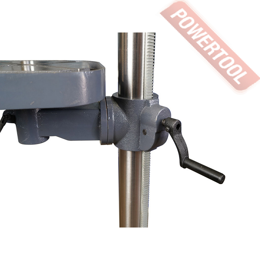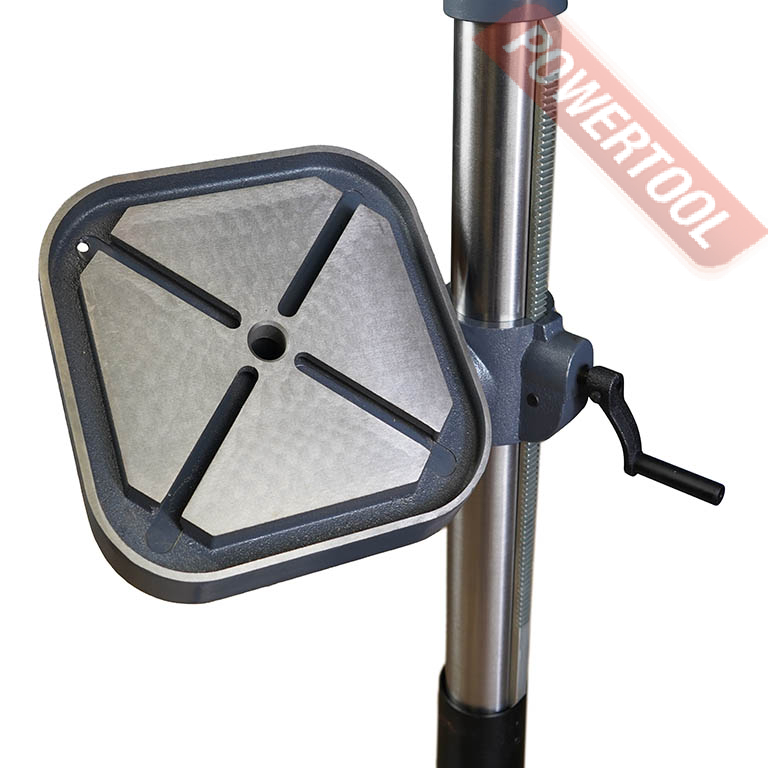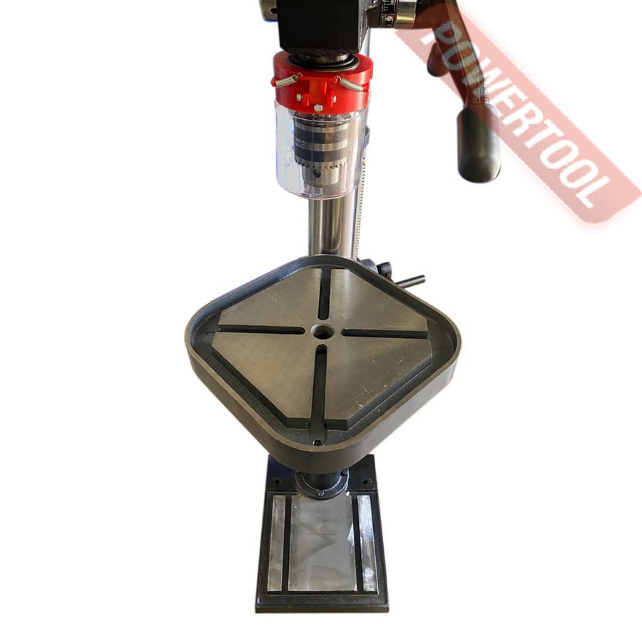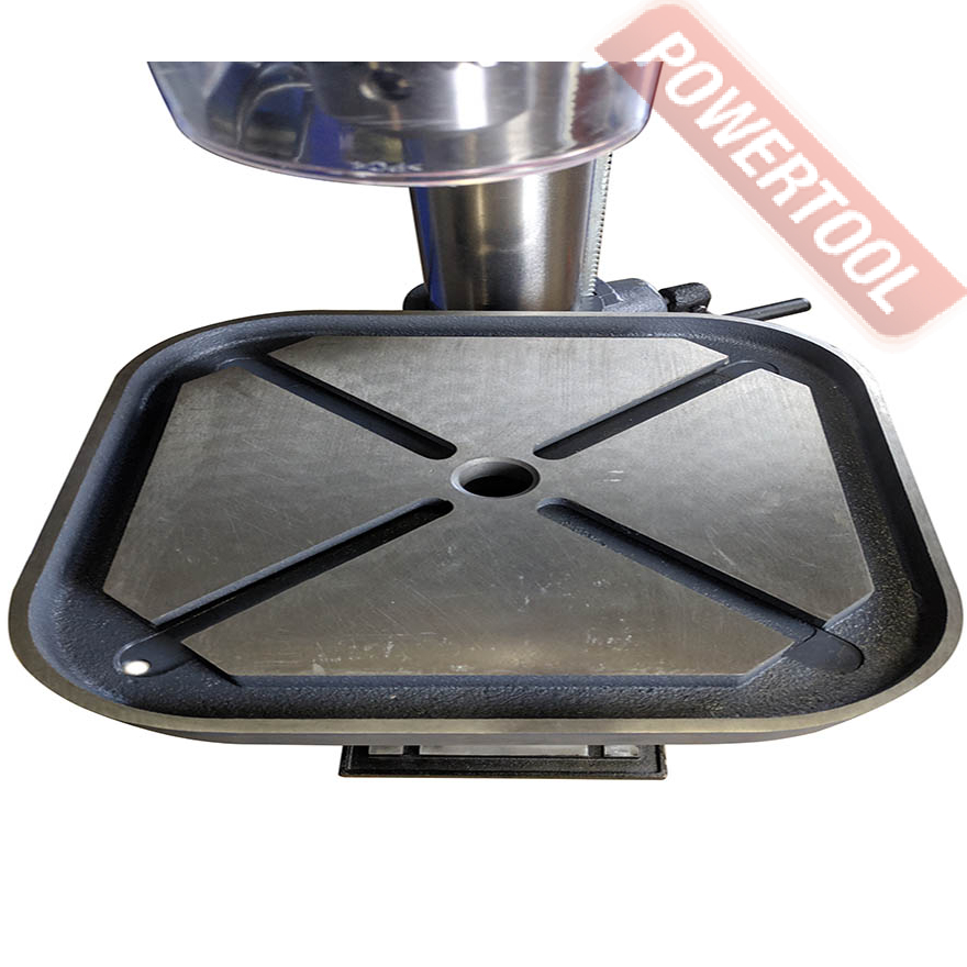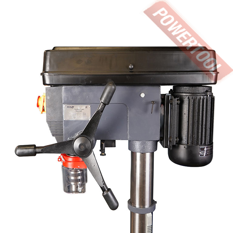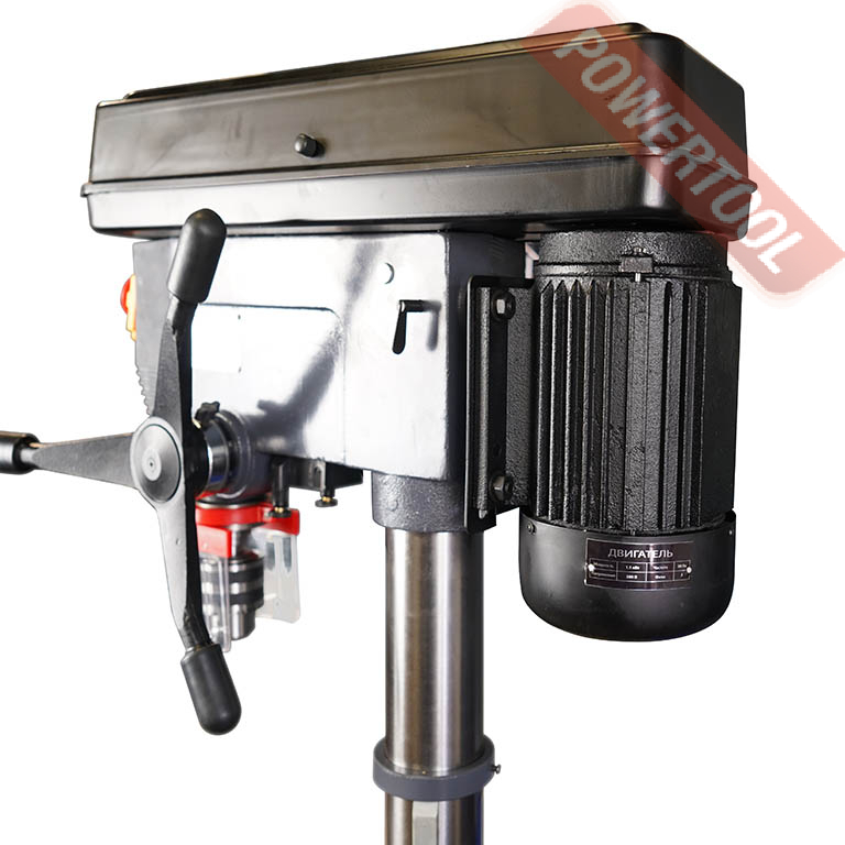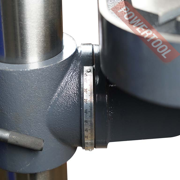 Станок оснащен мощным и надежным асинхронным двигателем с медной обмоткой мощностью 900 Вт. Сверлильный стол имеет возможность поворота на 45 градусов в обе стороны по вертикали для обработки отверстий под углом. Стол оснащен пазами для крепления заготовок и оснастки. Контроль угла поворота сверлильного стола осуществляется по шкале угломера. Модель дополнительно оснащен возможностью вращения стола на 360 градусов по горизонтали.