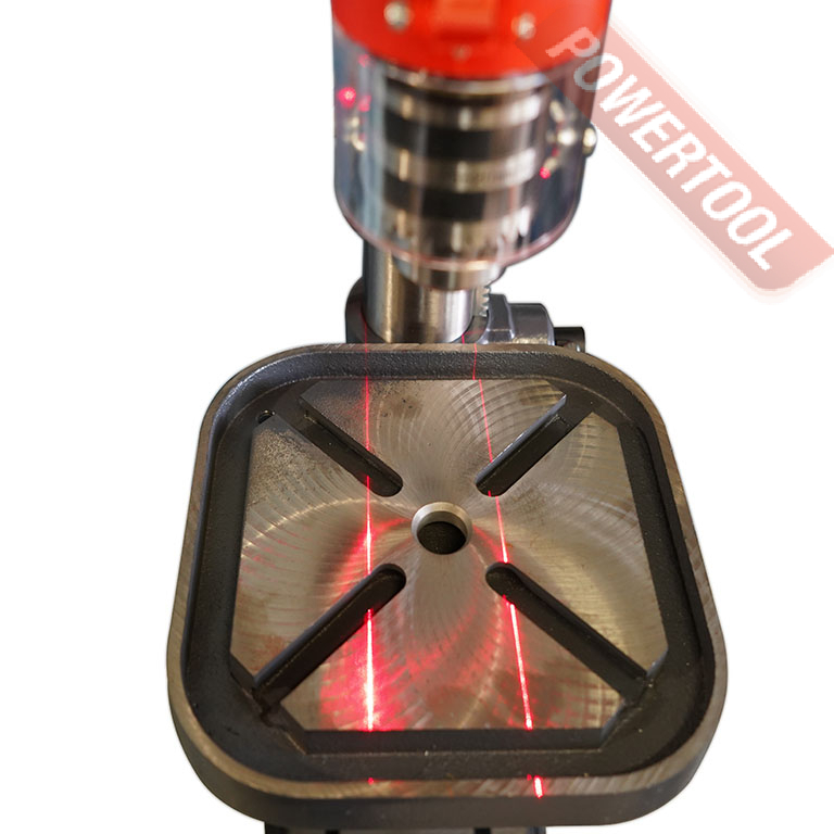 Станок оснащен лазерным указателем для корректной установки заготовки на рабочем столе что позволит с точностью просверлить отверстие там, где это необходимо. Станок установлен на мощное чугунное основание, на котором так же есть пазы для крепления заготовок и оснастки. Основание крепится к полу с помощью анкерных болтов.