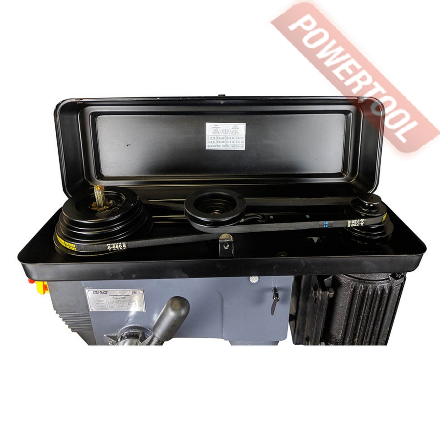 С правой стороны фрезерной головы расположена трех-лучевая рукоятка опускания пиноли с нониусом. Станок имеет возможность перемещения сверлильного стола по оси Z при помощи зубчатой рейки и вращения рукоятки. Скорость вращения шпинделя регулируется с помощью перекидывания ремней в блоке ременных шкивов. Схема расположения ремней с диапазоном оборотов расположена под защитной крышкой кожуха.