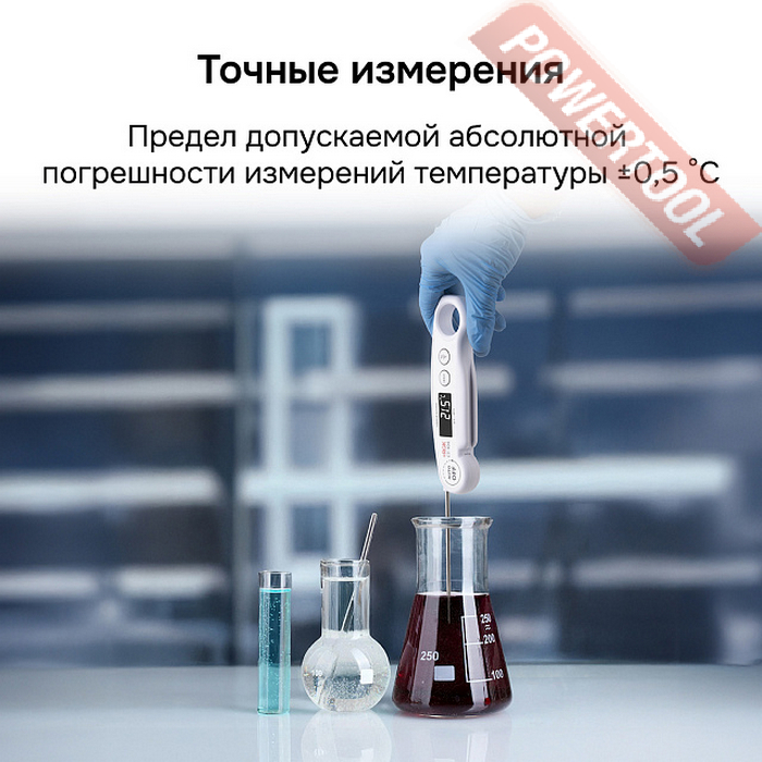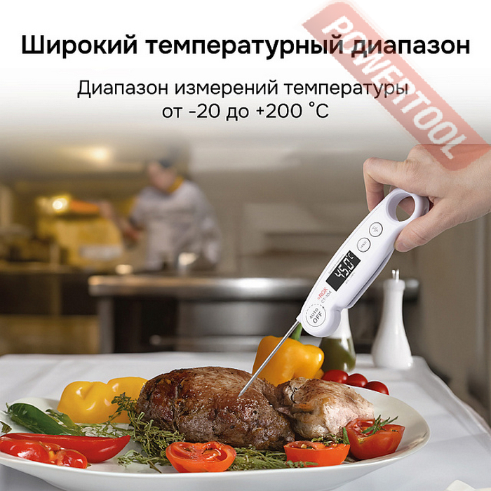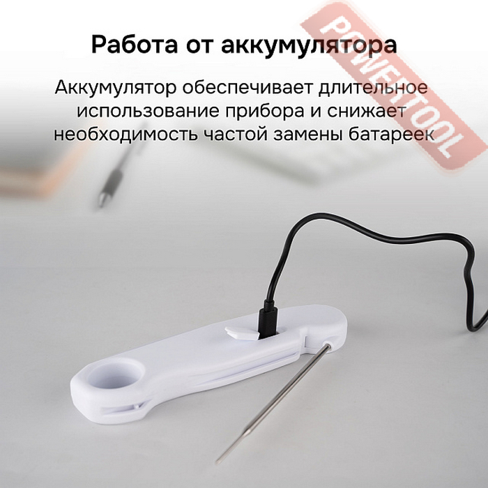 Контактный погружной пищевой термометр, внесён в госреестр СИ РФ, диапазон измерения от -20 до 200 градусов С, погрешность 0,5 градуса С при Т от -20 до 100 градусов С, 1 градус С при Т от 100 до 200 градусов С, температурное разрешение 0,1 градуса С, единицы измерения C/F, зонд NTC, длина зонда 113 мм, питание от полимерно-литиевой батареи 250 мА, защита от влаги и пыли IP65, индикатор удержания значения, автоотключение через 3 мин, магнитный держатель, габариты ДхШхВ 161х41х18 мм, вес 0,066 кг, кабель USB Type-C, поверка.
