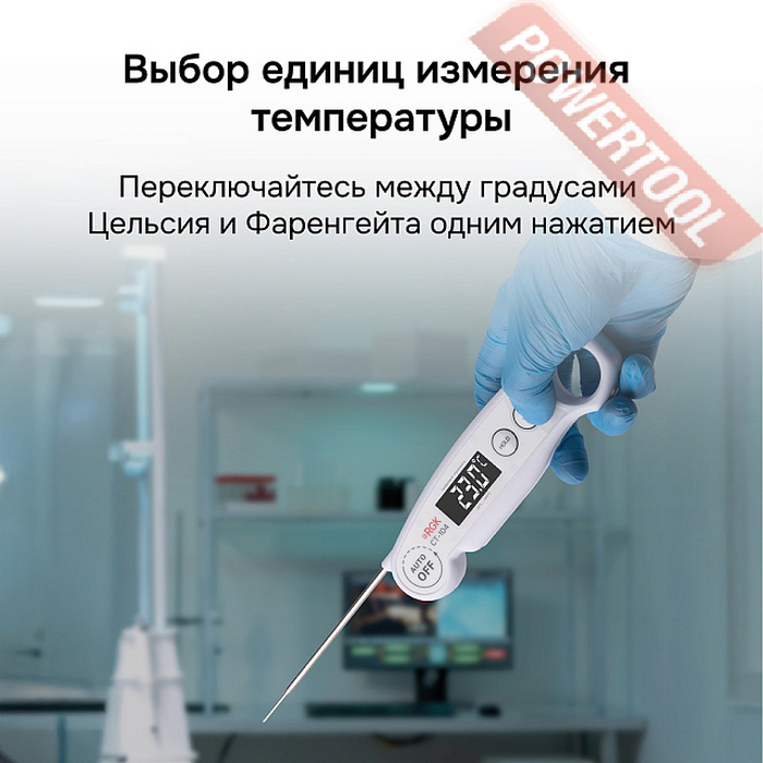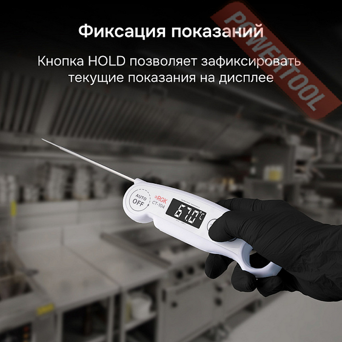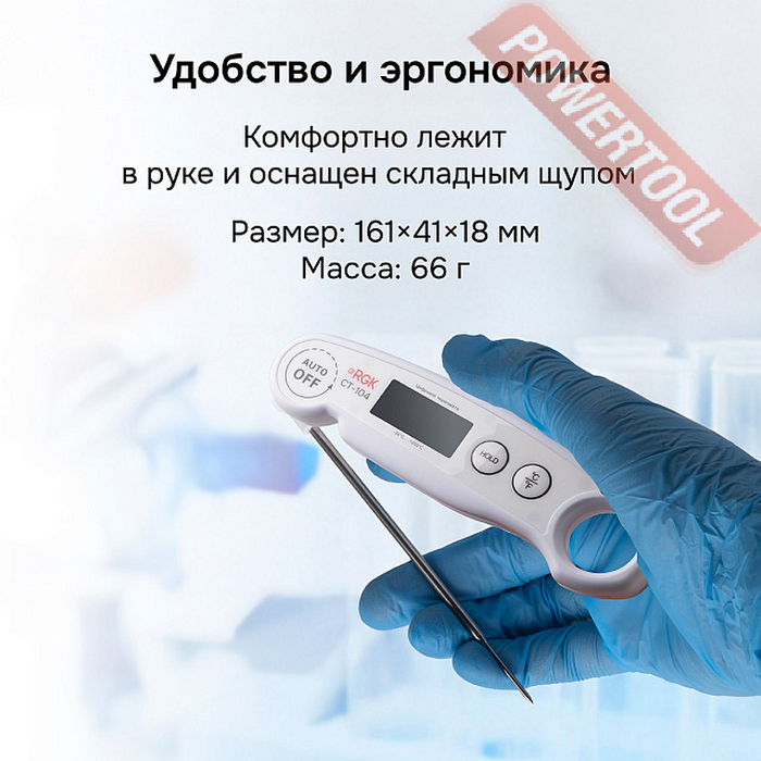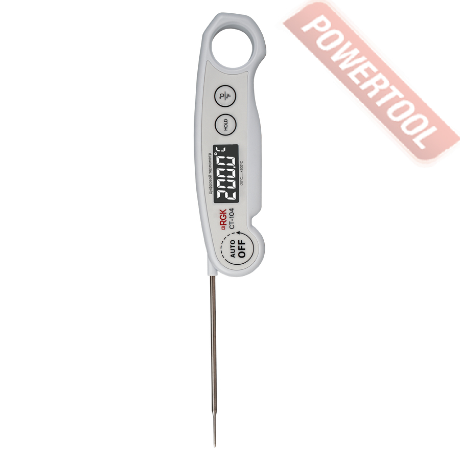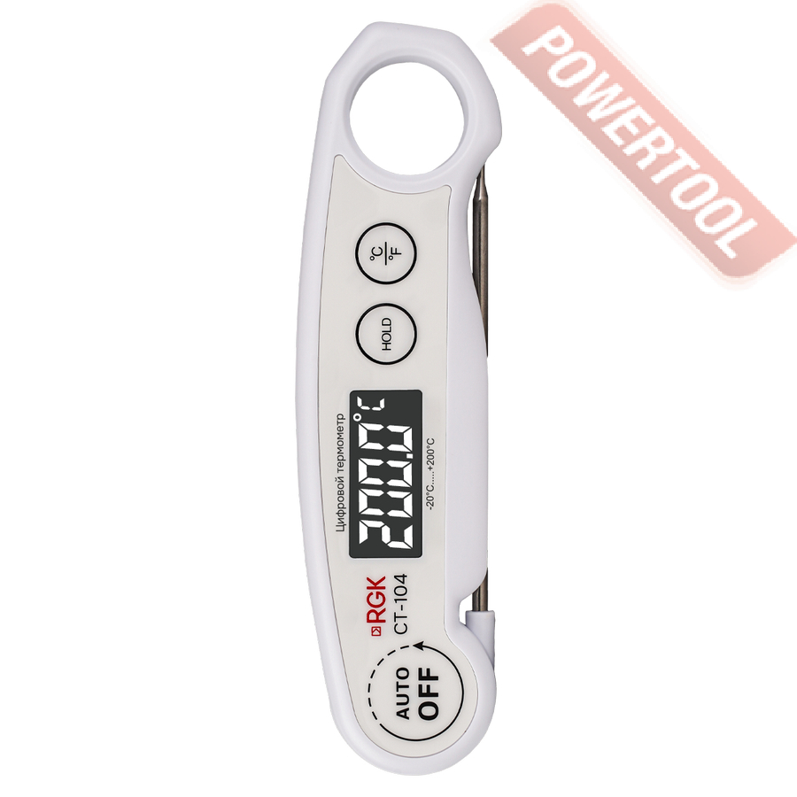 Компактный цифровой термометр RGK CT-104 активируется автоматически при раскладывании зонда. Результаты измерений могут отображаться в градусах Цельсия или Фаренгейта. Наличие функции HOLD, которая активируется при нажатии на соответствующую кнопку, упрощает считывание результатов при выполнении замеров труднодоступных местах и в неудобных положениях.