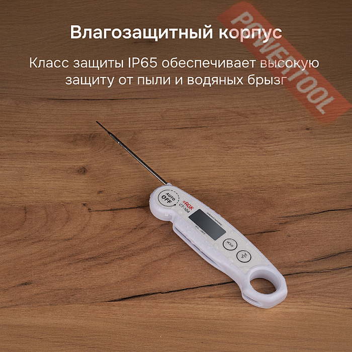 Термометр контактный пищевой RGK CT-104 с поверкой выполнен в виде складывающейся конструкции, благодаря чему обладает компактными размерами в нерабочем положении. Предназначенный для контактных измерений внутренней температуры жидких, вязких, сыпучих и прочих веществ, прибор оборудован тонким погружным зондом длиной 112,6 мм и диаметром в основной части 3,5 мм. В качестве сенсора в данном изделии используется термопара, за счет чего обеспечивается высокое быстродействие и точность измерителя.