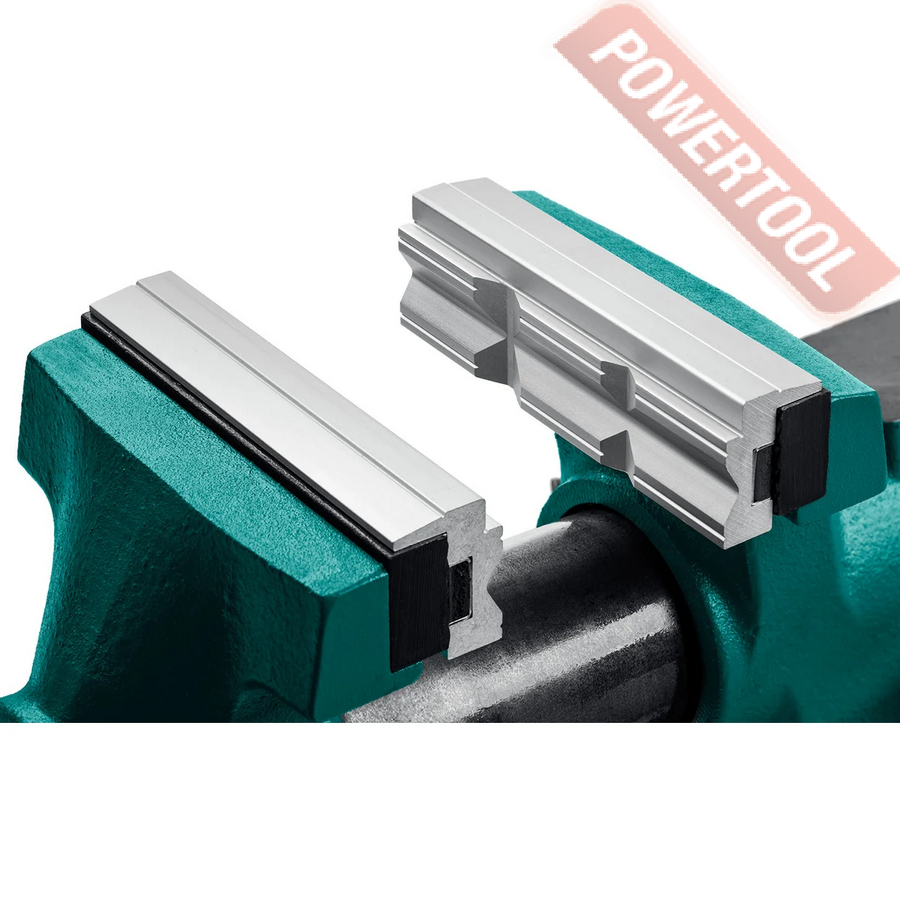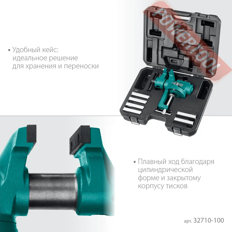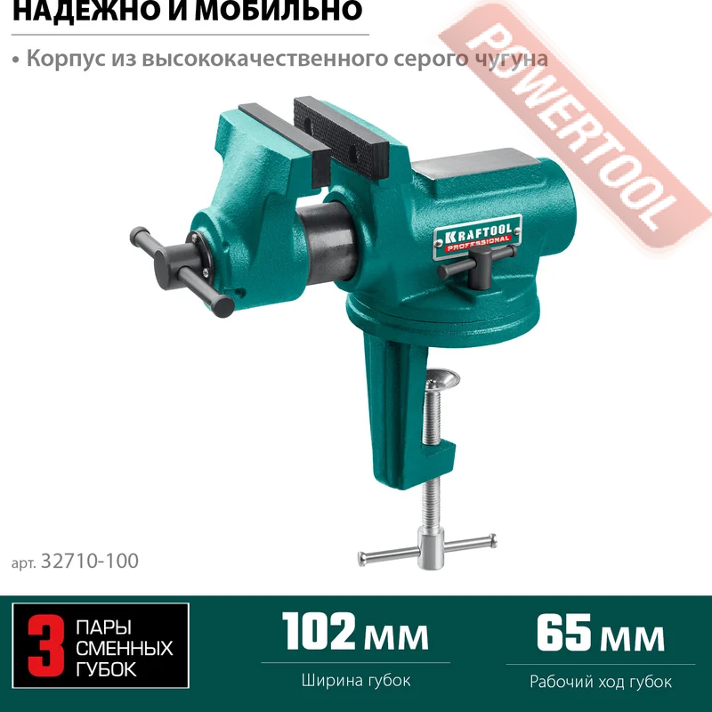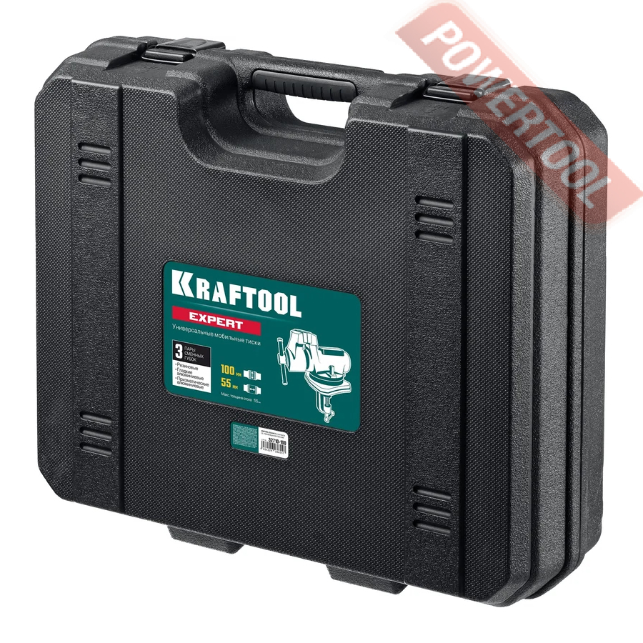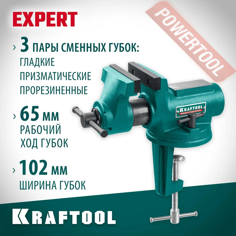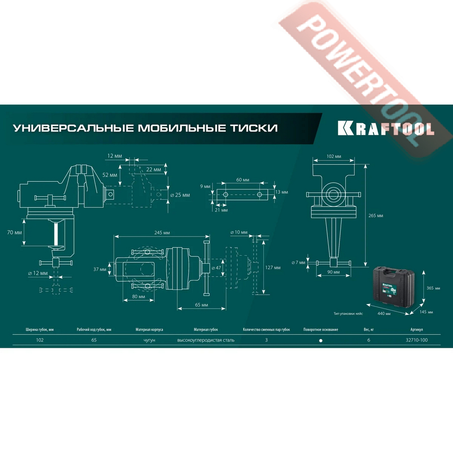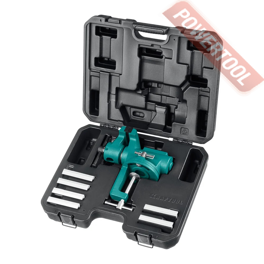 Тиски слесарные для точных работ, ширина губок 102 мм, рабочий ход 65 мм, высота губок 22 мм, глубина зева 52 мм, наковальня, струбница, функция поворота 360 градусов, размер ДхШхВ 245х121х265 мм, вес 6 кг, три пары сменных губок, кейс.