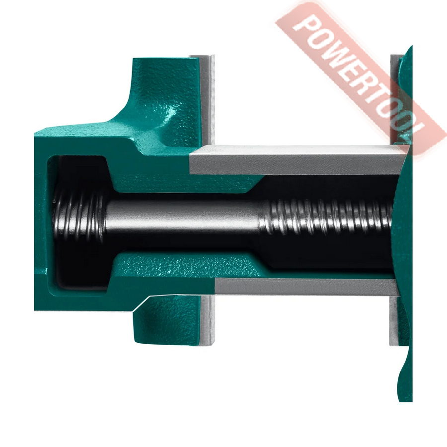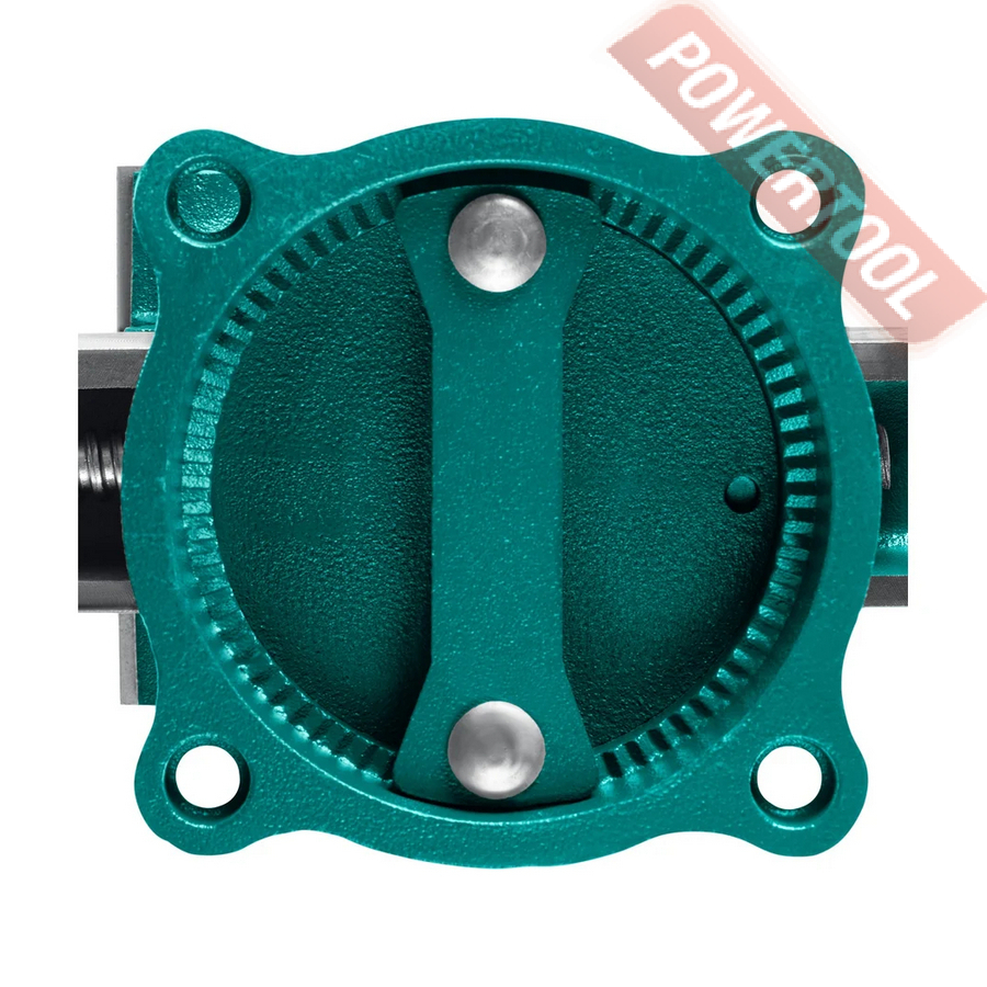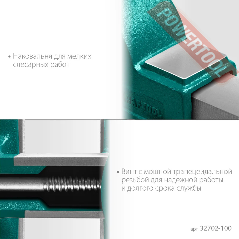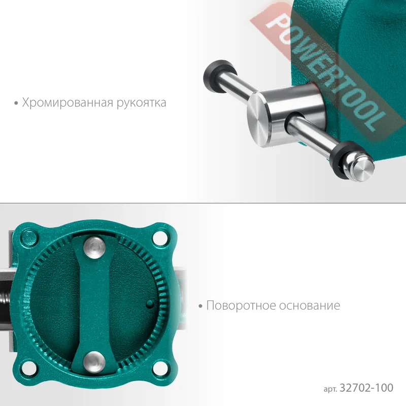 Тиски слесарные поворотные, ширина губок 100 мм, рабочий ход 100 мм, глубина зева 67 мм, наковальня, трубный зажим, функция поворота 360 градусов, размер ДхШхВ 333х145х168 мм, вес 9,5 кг.