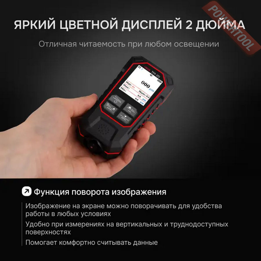 • Наглядность – толщиномер снабжен цветным 2-дюймовым дисплеем с подсветкой, который одновременно отображает основные и дополнительные данные; для удобства считывания показаний при различном положении прибора предусмотрена возможность поворота экрана при нажатии соответствующей кнопки.