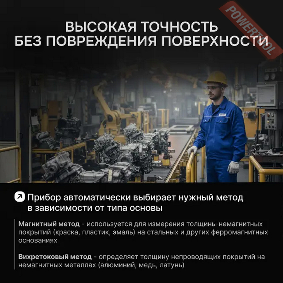 • Точность – для минимизации погрешности инструмент выполняет самокалибровку индуктивного сенсора при каждом включении и поддерживает режим пользовательской 6-точечной и нулевой калибровки, с использованием комплектных стандартных образцов подложки из разных материалов и калибровочной плёнки нормированной толщины.