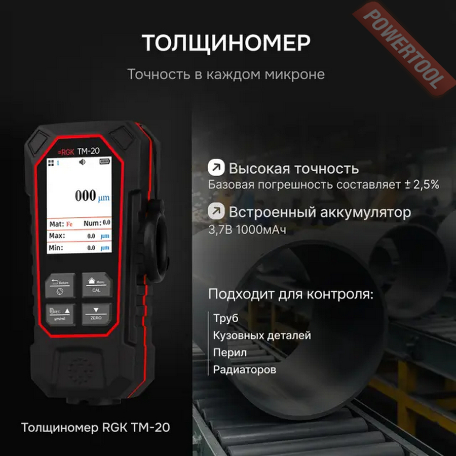 Толщиномер RGK TM-20, который относится к мобильным приборам неразрушающего контроля, реализует магнитные и вихретоковые измерения, позволяя определять толщину нетокопроводящих покрытий на любых металлах, как черных, так и цветных. Он способен выполнять разовые и непрерывные замеры на гладких и неровных поверхностях с выпуклостью до 5 мм и вогнутостью до 30 мм, наличие настроечного меню дает возможность гибко адаптировать инструмент под конкретные задачи. Он поддерживает функции сохранения данных и акустической сигнализации, благодаря чему подходит не только для бытового применения, но и для профессионального использования.