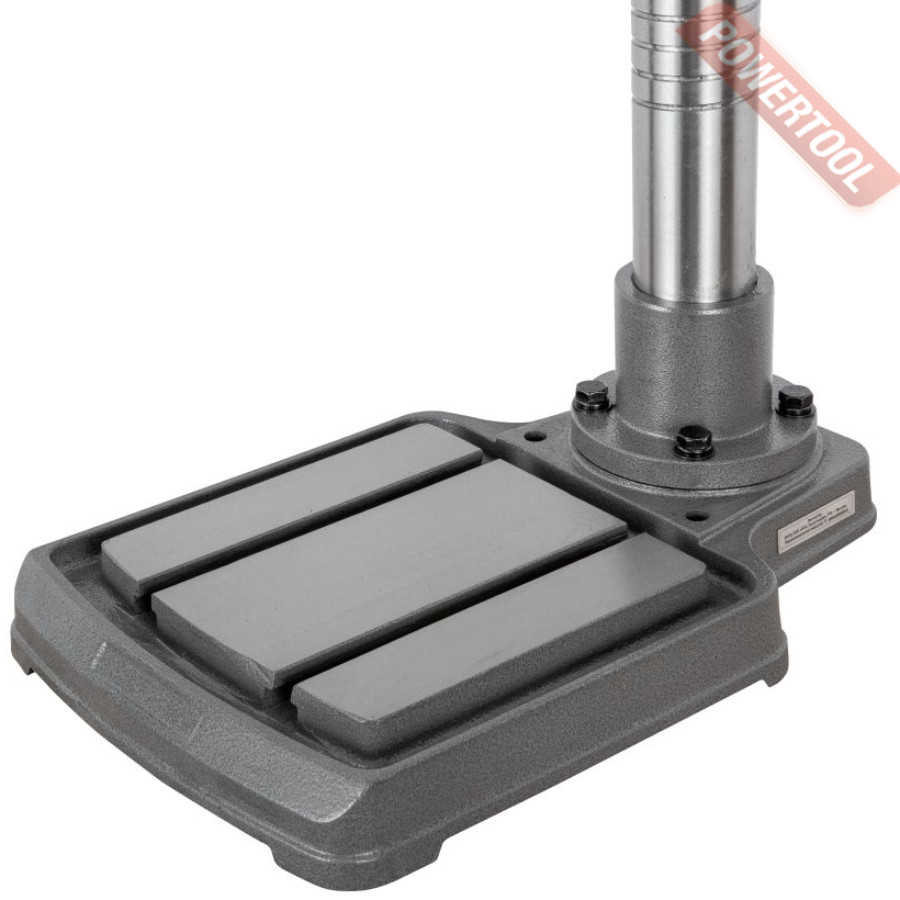 Вертикально-сверлильный станок JET JDP-14M 220В имеет устойчивое чугунное основание размером 490x310 мм, с рабочей поверхностью стола 238х240 мм, на которой предусмотрены 2-Т образных паза с шириной 14 мм, для установки тисков или других зажимных приспособлениями. Расстояние между пазами 120 мм. На основание установлена колонна диаметром 70мм с винтовой канавкой для возможности перемещения сверлильной головы по вертикали. Максимальное расстояние между шпинделем и столом-основанием, составляет 540 мм.