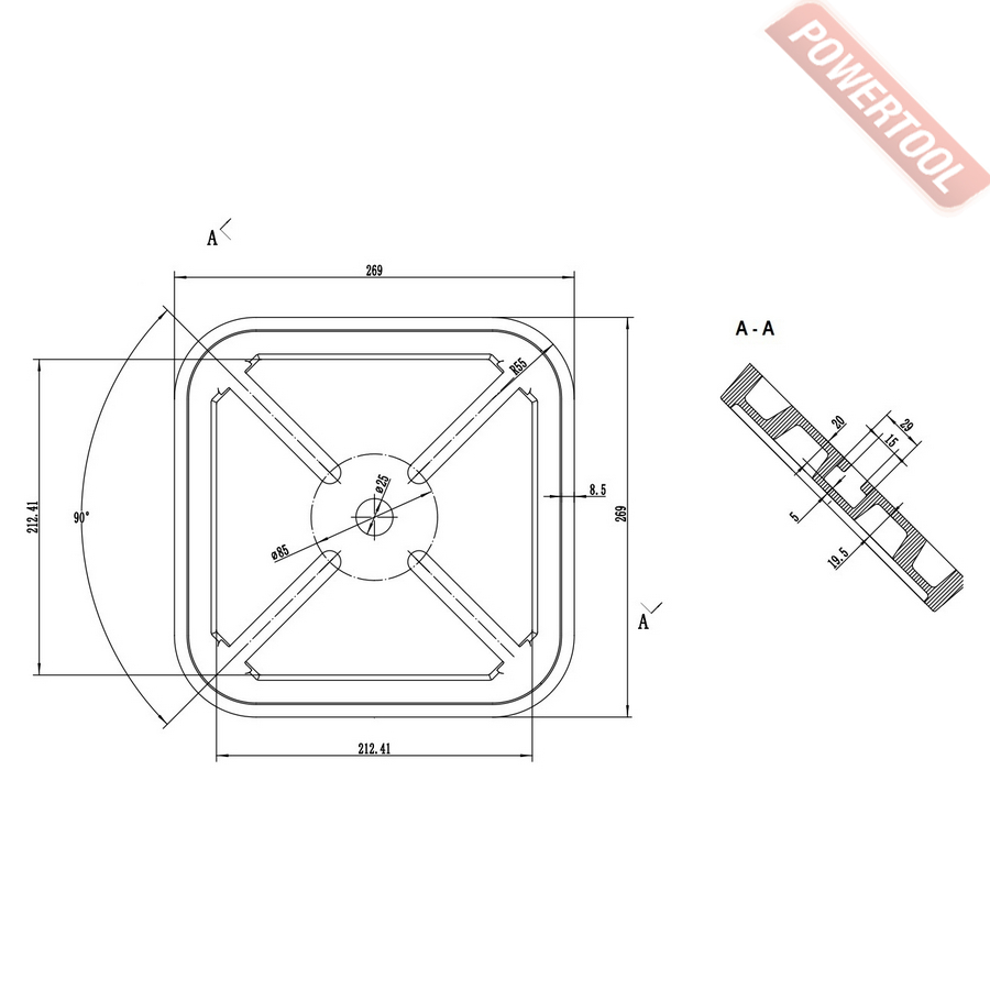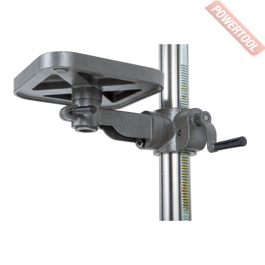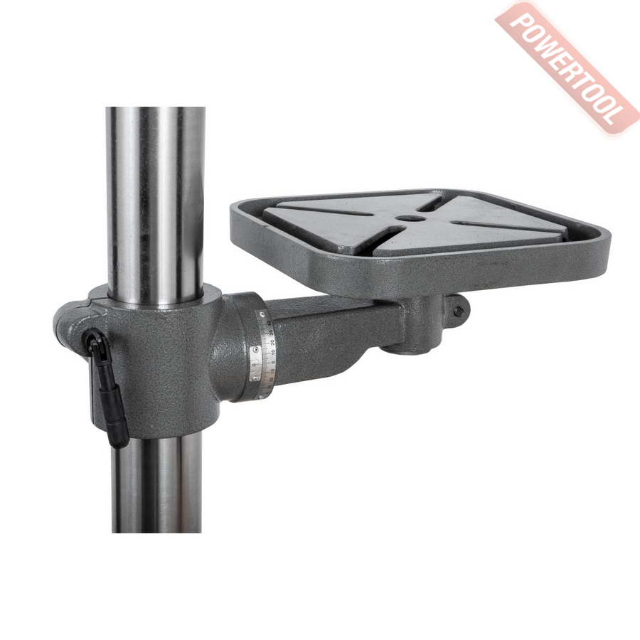 На основание установлена колонна диаметром 73 мм с зубчатой рейкой для возможности перемещения стола по вертикали. Рабочий стол, как и основание, изготовлен из качественного чугуна, его размер 270х270 мм с 4-мя Т-образными пазами, расположенными крест-накрест, ширина пазов 15 мм. Максимальное расстояние между шпинделем и основанием составляет 690 мм, а расстояние между шпинделем и рабочим столом – 465 мм.