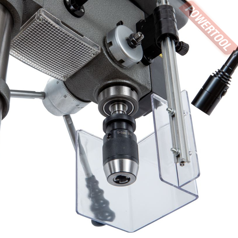 Стандартная комплектация включает в себя быстрозажимной сверлильный патрон 1-16 мм/В16, защитный экран, лампу местного освещения и инструкцию по эксплуатации.