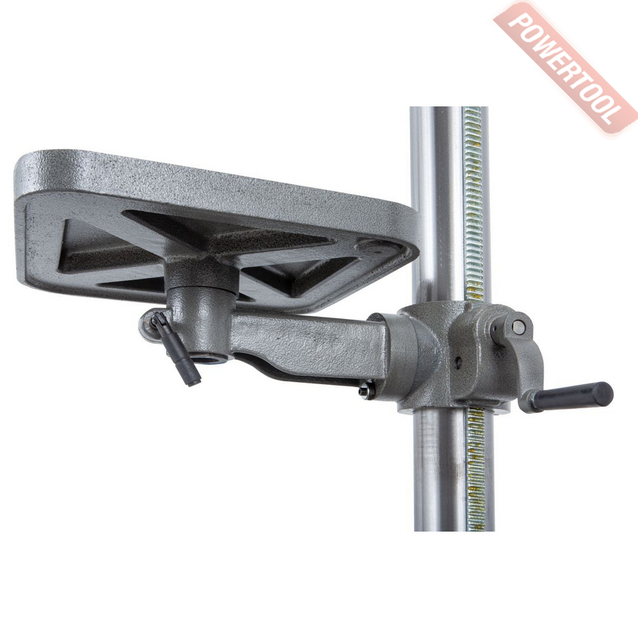 На основание установлена колонна диаметром 80мм с зубчатой рейкой для возможности перемещения стола по вертикали. Рабочий стол, как и основание, изготовлен из качественного чугуна, его размер 315х315 мм с 4-мя Т-образными пазами, расположенными крест-накрест, ширина пазов 15мм. Максимальное расстояние между шпинделем и основанием составляет 1220 мм, а расстояние между шпинделем и рабочим столом – 720 мм.