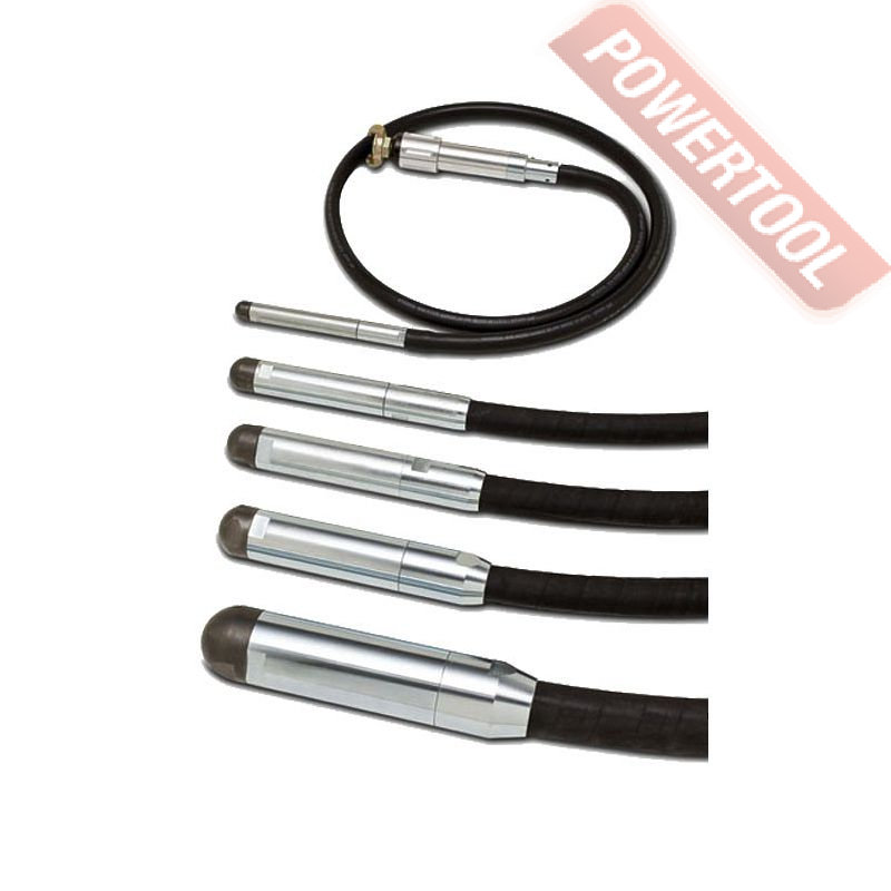 Глубинный вибратор для уплотнения бетона, пневматический привод, рабочее давление 6 бар, расход воздуха 750 л/мин, центробежная сила 5 кН, эффективный диаметр уплотнения до 76 см, частота колебаний 17000, диаметр булавы 58 мм, длина булавы 345 мм, длина вала 2 м, вес 7 кг.