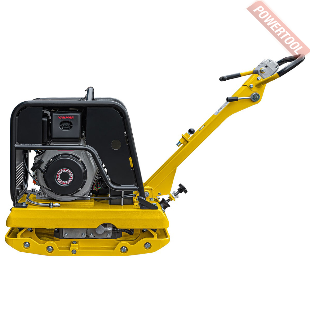 Виброплита реверсивная, вес 350 кг, плита 860х485 мм, усилие уплотнения 45 кН, гидравлический привод, 4-тактный дизельный двигатель Yanmar L100AE объемом 435 куб.см и мощностью 10 л.с., топливный бак 4,7 л, расход топлива 1,69 л/ч, объем картера 1,6 л, колесный комплект, электростарт, АКБ, размер 1570х485х930 мм.