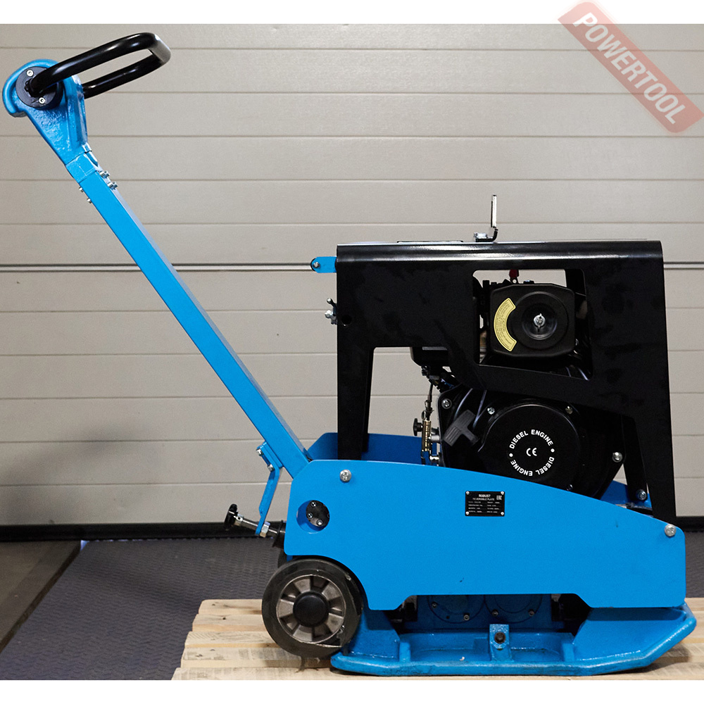 - Для удобства перемещения по строительной площадке виброплита имеет встроенные транспортировочные колеса, которые занимают мало места. Они уникальны. Достаточно просто поднять направляющую рукоятку, закрепить её и можно перемещать плиту.