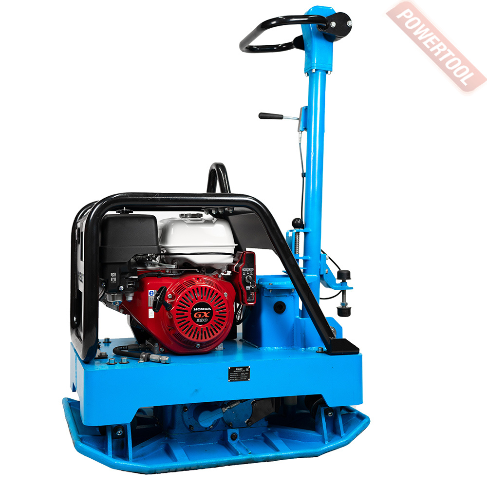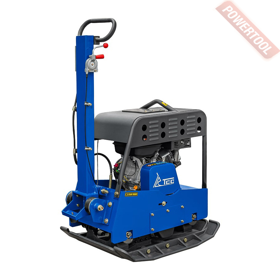 - Инновационная рукоять управления имеет эргономичную форму и полностью откидывается вперед, что с одной стороны очень удобно при транспортировке, а с другой стороны позволяет управлять плитой одной рукой и особенно удобна в поворотах. В месте соединения рукоятки с плитой стоят дополнительные амортизаторы для снижения уровня вибрации дополнительные амортизаторы встроены в ручку управления с которой непосредственно контактирует оператор, т.е. виброзащита носит двойной характер. Безопасная транспортировка обеспечивается безлюфтовым механизмом блокировки направляющей рукояти.