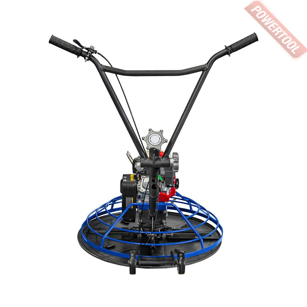 Однороторная затирочная машина по бетону, рабочая ширина 956 мм, диск диаметром 956 мм или 4 лопасти, диапазон наклона лопастей 0-15 градусов, регулируемая скорость вращения диска, рукоятка управления регулируется по высоте, 4-тактный бензиновый двигатель Honda GX160 объемом 163 куб.см и мощностью 4,8 л.с., топливный бак 3,6 л, расход топлива 1,4 л/ч, емкость картера 0,6 л,размеры 1820х1130х970 мм, вес 73 кг, лопасти, затирочный диск.
